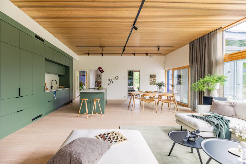 Olemme iloisia, että pääsimme osaltamme vaikuttamaan tämän lämpimän tunnelmaan syntyyn: Villa Satakielen yhdistetyn olohuone + keittiö -tilan katto verhoiltiin nimittäin tammen sävyisellä akustiikkarimapaneelillamme (LP1-B-O-05).