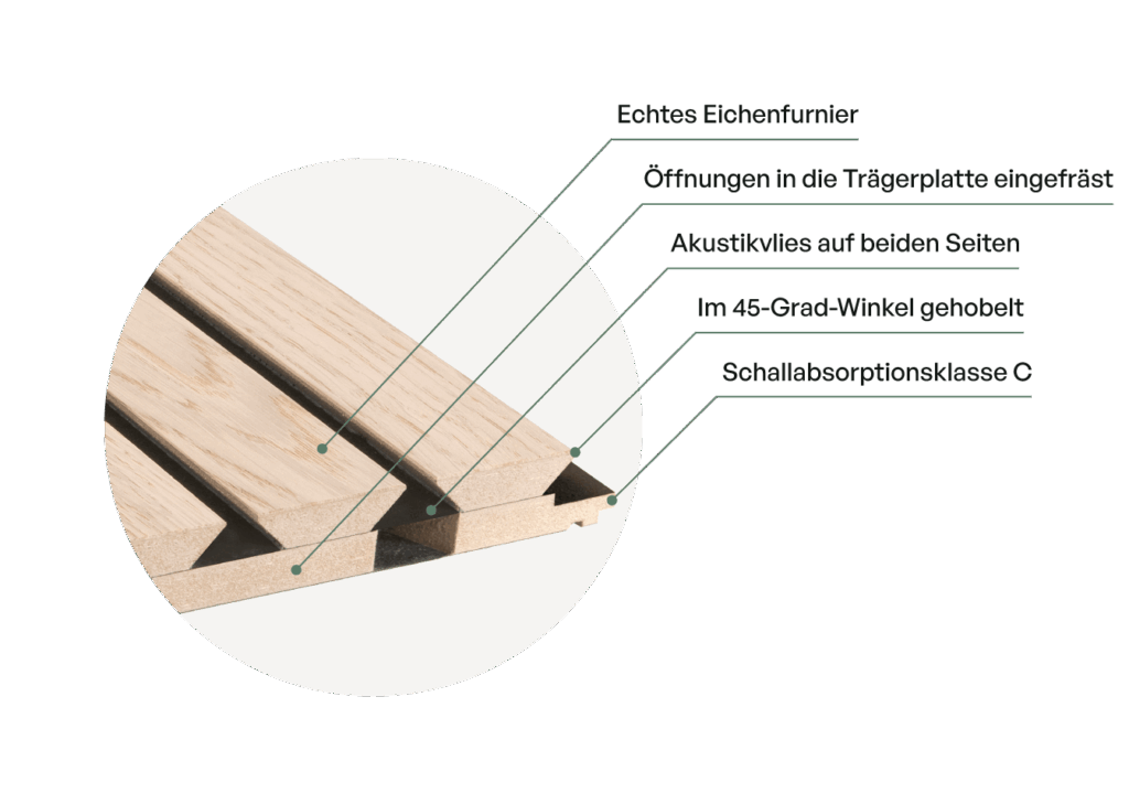 Die akustischen Eigenschaften unserer Paneele beruhen auf einer Kombination aus Schallabsorption und -diffusion: Das Akustikvlies und die Öffnungen absorbieren den Schall, während das Design der Lamellen die Schallreflexion streut.