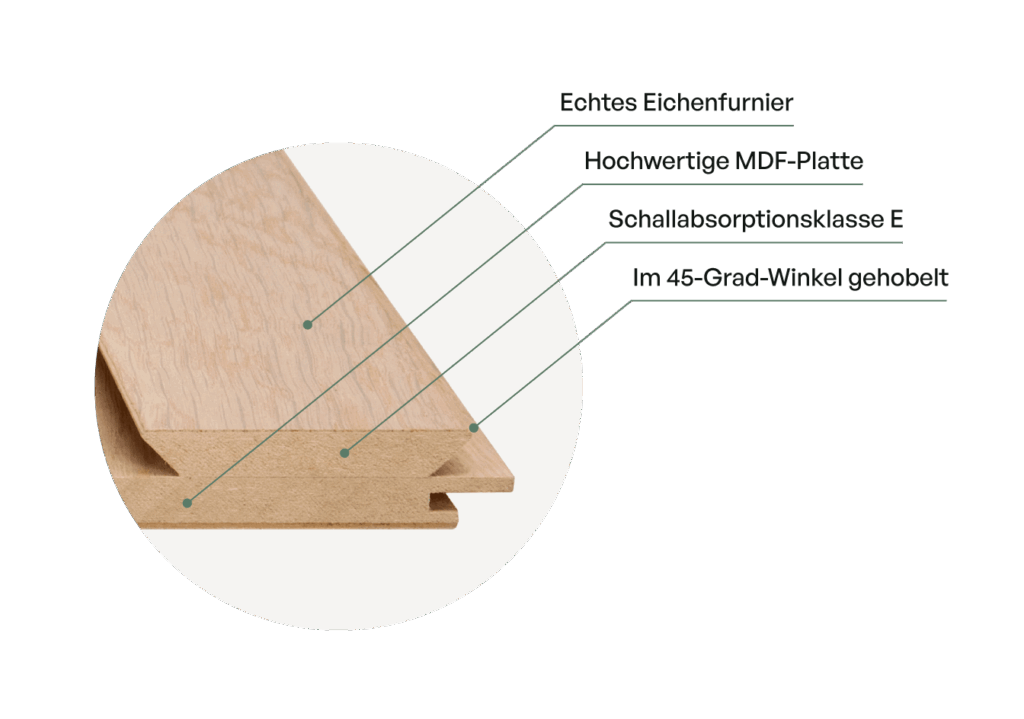 Die Lamellen sind im 45-Grad-Winkel gehobelt, was den Paneelen ein edles, dreidimensionales Aussehen verleiht. Das Design verbessert zudem die akustischen Eigenschaften des Paneels: Der Winkel zwischen den Lamellen streut den Schall. Unsere Lamellenpaneele gehören zur Schallabsorptionsklasse E. Weitere Informationen zur Akustik finden Sie unten.