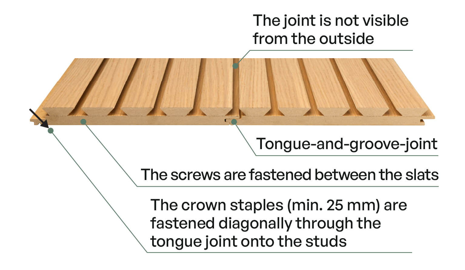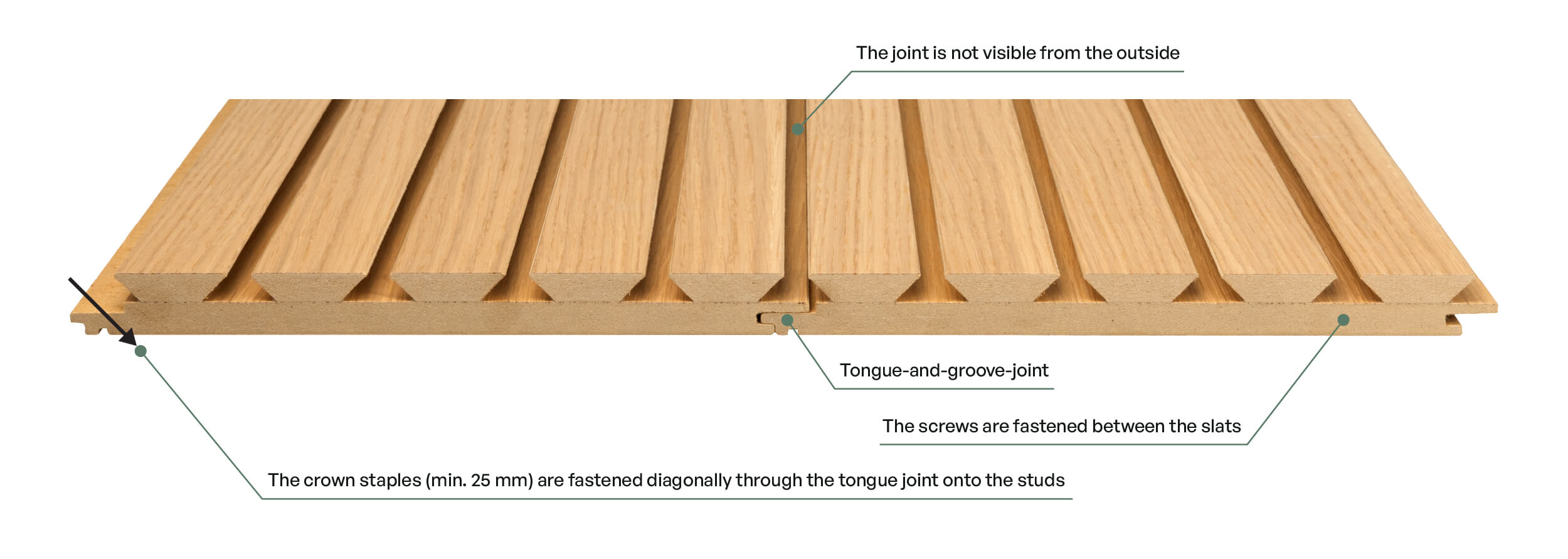 Acoustic panels are fastened onto the studding using crown staples. The staples should be fastened diagonally through the tongue joint. The staple length must be at least 25 mm. Fasten 2–3 staples per stud, depending on its width.