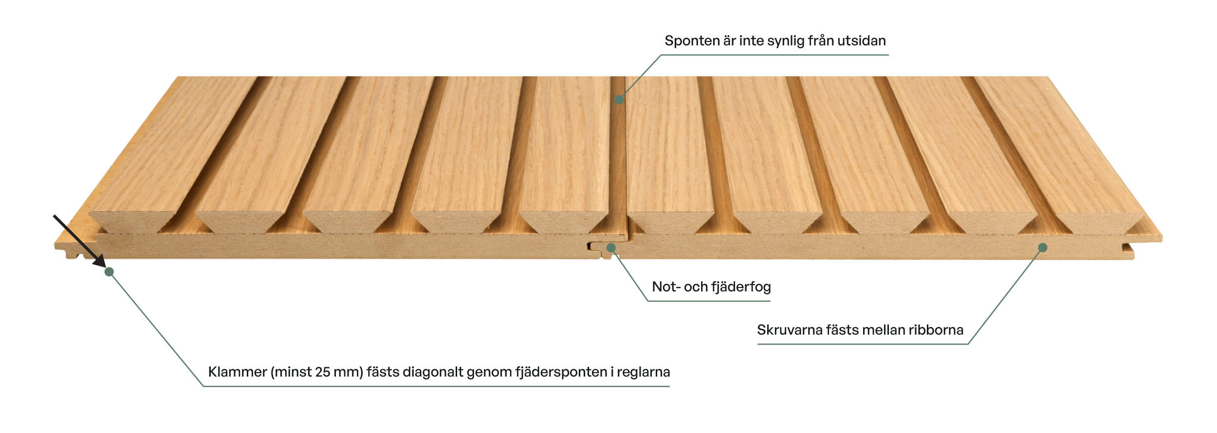 Akustikpaneler fästs i reglarna med klammer. Klammern bör fästas diagonalt genom fjädersponten. Klammerns längd bör vara minst 25 mm. Fäst 2-3 klammer per regel beroende på dess bredd.