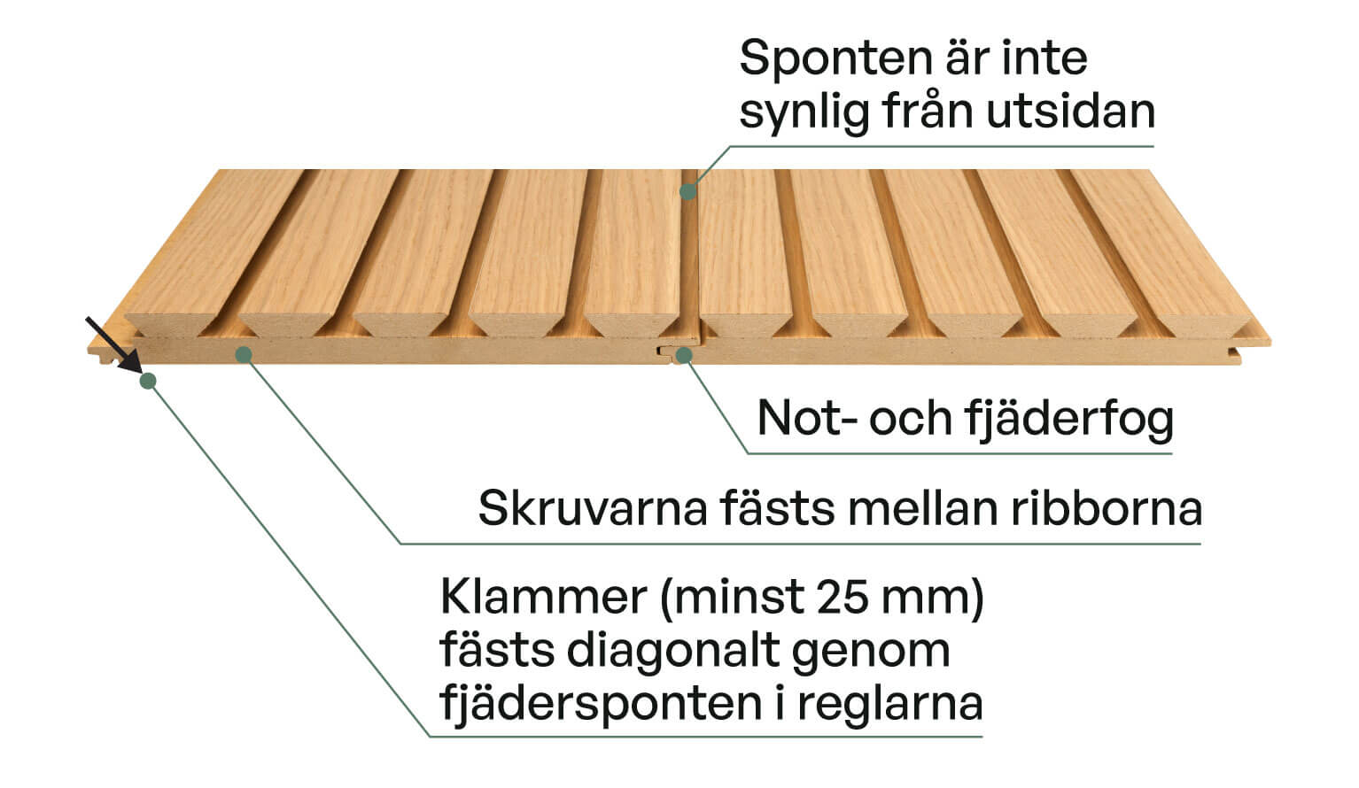 Fäst klammern genom fjädern, se till att följande panel döljer klammern. Fäst 2–3 klammer per regel beroende på dess bredd.