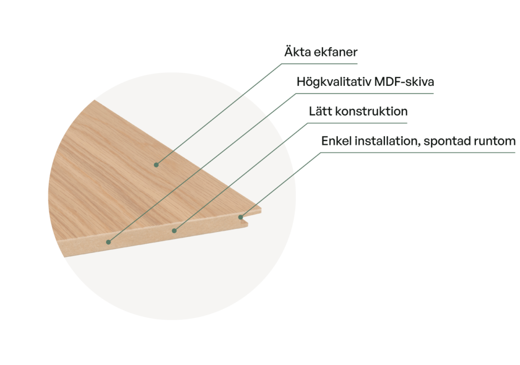 Släta panelernas yta är av äkta ekfaner vilket får panelerna att se levande och naturliga ut. Panelens basskiva är tillverkad av högkvalitativ MDF. Fanering ger hållbarhet och böjhållfasthet till den färdiga produkten, dessutom underlättar det monteringen.
